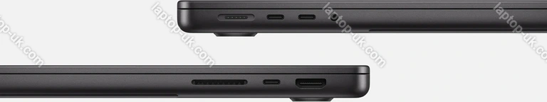 - 3x Thunderbolt 4 / USB4 with DisplayPort 1.4 (40Gb/s, PD-Out, power input PD-In), 1x HDMI 2.1, 1x 3.5mm audio jack, 1x SD Card, 1x DC-In Apple MagSafe 3 (power input)