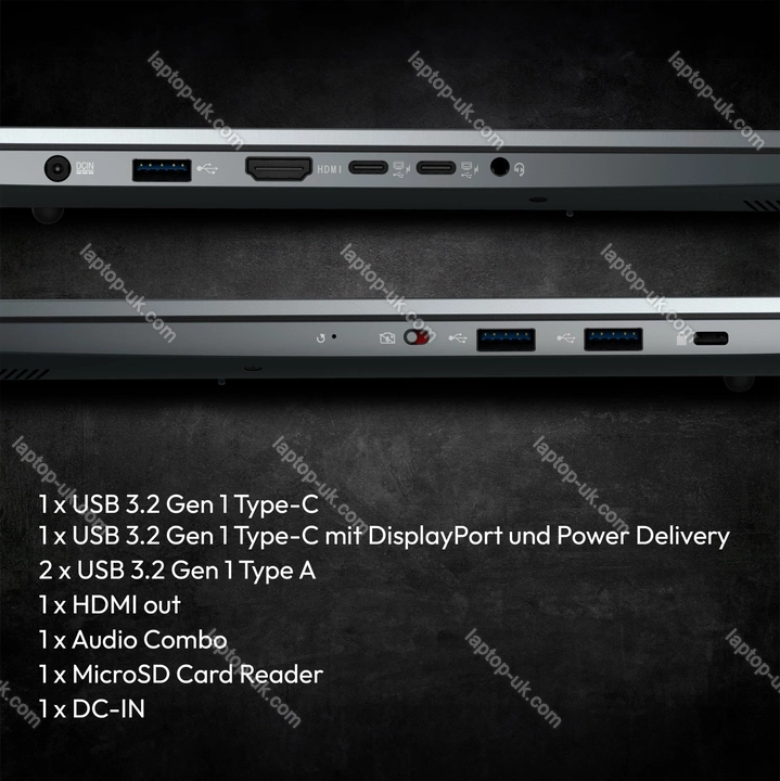 - 1x USB-C 3.0 with DisplayPort (5Gb/s, PD-Out), 1x USB-C 3.0 with DisplayPort (5Gb/s), 3x USB-A 3.0 (5Gb/s), 1x HDMI, 1x 3.5mm audio jack Line-in/out, 1x microSD, 1x DC-in (power input)