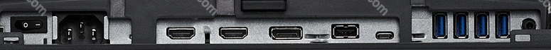 - 1x DisplayPort 1.2, 2x HDMI 2.0a, 1x USB-C 3.0 with DisplayPort 1.2 (Upstream, 5Gb/s, PD-Out 60W), 4x USB-A 3.0 (downstream, 5Gb/s), 1x 3.5mm jack Line-Out, 1x AC-In C14