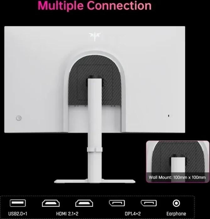 - 2x DisplayPort 1.4 (300Hz@2560x1440), 2x HDMI 2.1 (300Hz@2560x1440), 1x USB-A 2.0 (480Mb/s), 1x 3.5mm jack Line-Out, 1x DC In hollow socket