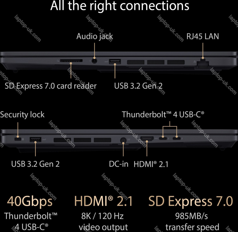 - 1x HDMI 2.1, 2x USB-A 3.1 (10Gb/s), 2x Thunderbolt 4 (40Gb/s, PD 3.0), 1x Gb LAN, 1x jack, 1x hollow socket (mains connection, 6mm)