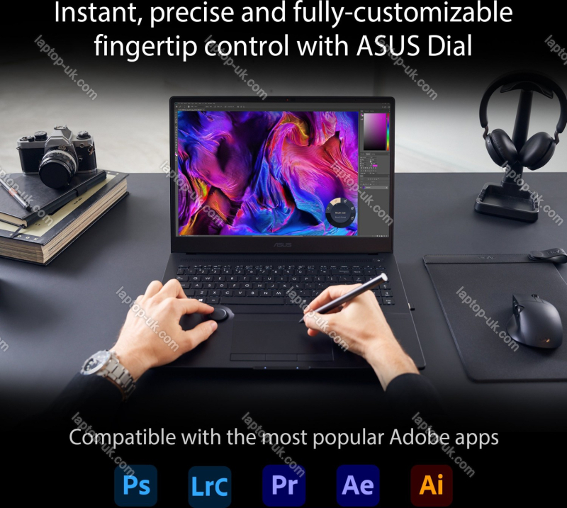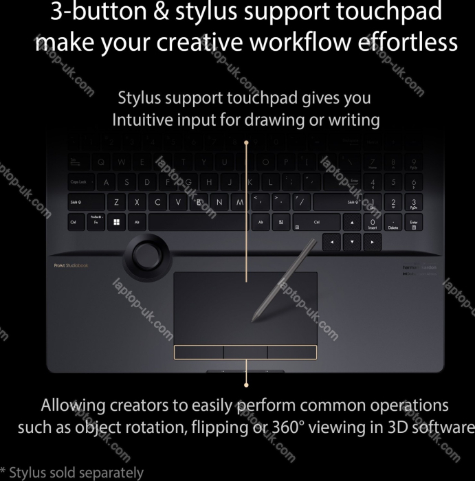 - Keyboard with UK-layout (illuminated, keypad, Rubber-Dome, 1.4mm actuator travel), touchpad (3 remote mouse buttons bottom), rotary knob (ASUS Dial)