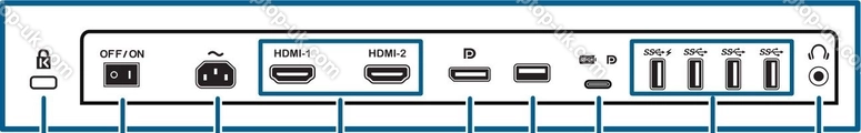 - 1x DisplayPort 1.2, 2x HDMI 2.0a, 1x USB-C 3.0 with DisplayPort 1.2 (Upstream, 5Gb/s, PD-Out 60W), 4x USB-A 3.0 (downstream, 5Gb/s), 1x 3.5mm jack Line-Out, 1x AC-In C14
