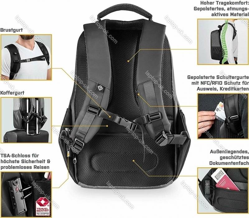 - carrying handle, trolley fastening, smartphone compartment, security lock (TSA-certified), RFID-protective compartment, USB charging connector