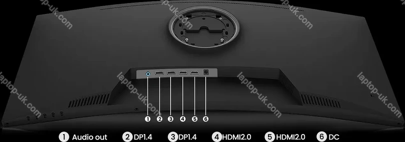 - 2x DisplayPort 1.4 (165Hz@3440x1440), 2x HDMI 2.0 (100Hz@3440x1440), 1x 3.5mm jack Line-Out, 1x DC In hollow socket