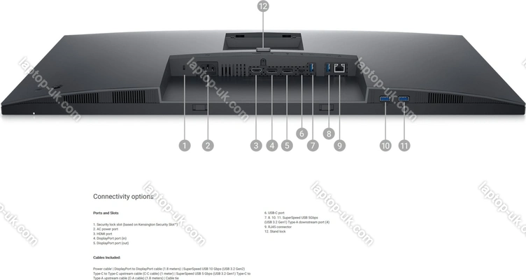 - 1x DisplayPort 1.4, 1x HDMI 1.4, 1x USB-C 3.0 with DisplayPort 1.4 (Upstream, 5Gb/s, PD-Out 90W), 4x USB-A 3.0 (downstream, 5Gb/s), 1x RJ-45 (1000Base-T), 1x DisplayPort-Out, 1x AC-In C14