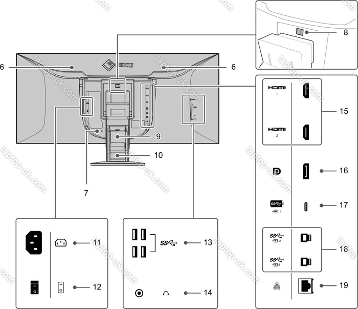 - 1x DisplayPort 1.2, 2x HDMI 1.4, 1x USB-C 3.0 with DisplayPort 1.2 (Upstream, 5Gb/s, PD-Out 85W), 2x USB-B 3.0 (Upstream, 5Gb/s), 4x USB-A 3.0 (downstream, 5Gb/s), 1x 3.5mm jack Line-Out, 1x RJ-45 (1000Base-T), 1x AC-In C14
