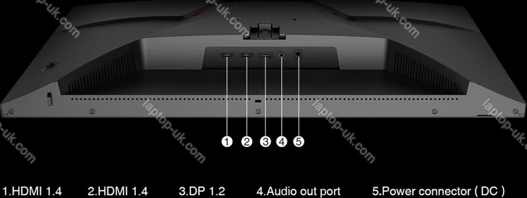 - 1x DisplayPort 1.2 (165Hz@1920x1080), 2x HDMI 1.4 (144Hz@1920x1080), 1x 3.5mm jack Line-Out, 1x DC In hollow socket
