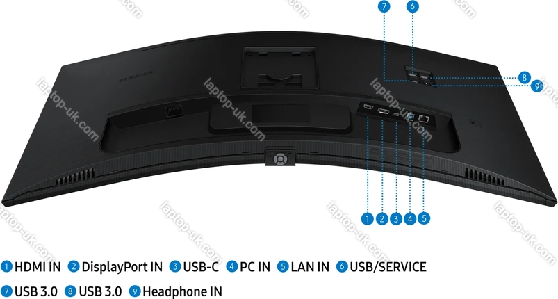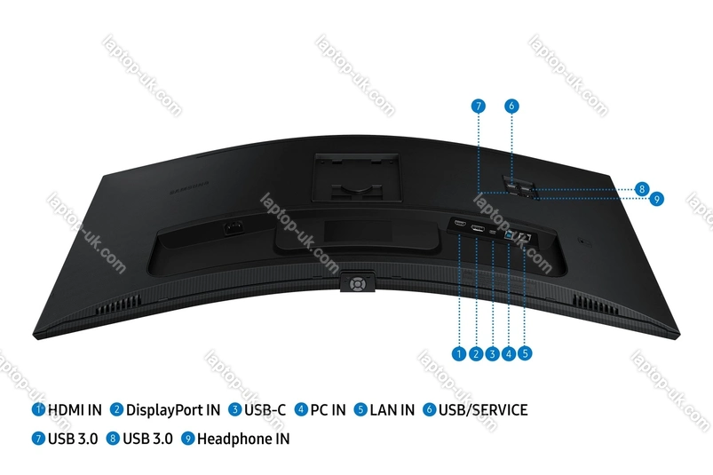 - 1x DisplayPort 1.2 (100Hz@3440x1440), 1x HDMI 2.0 (100Hz@3440x1440), 1x USB-C 3.0 with DisplayPort 1.2 (Upstream, 5Gb/s, PD-Out 90W, 100Hz@3440x1440), 1x USB-B 3.0 (Upstream, 5Gb/s), 3x USB-A 3.0 (downstream, 5Gb/s), 1x 3.5mm jack Line-Out, 1x RJ-45 (1000Base-T), 1x AC-In C14